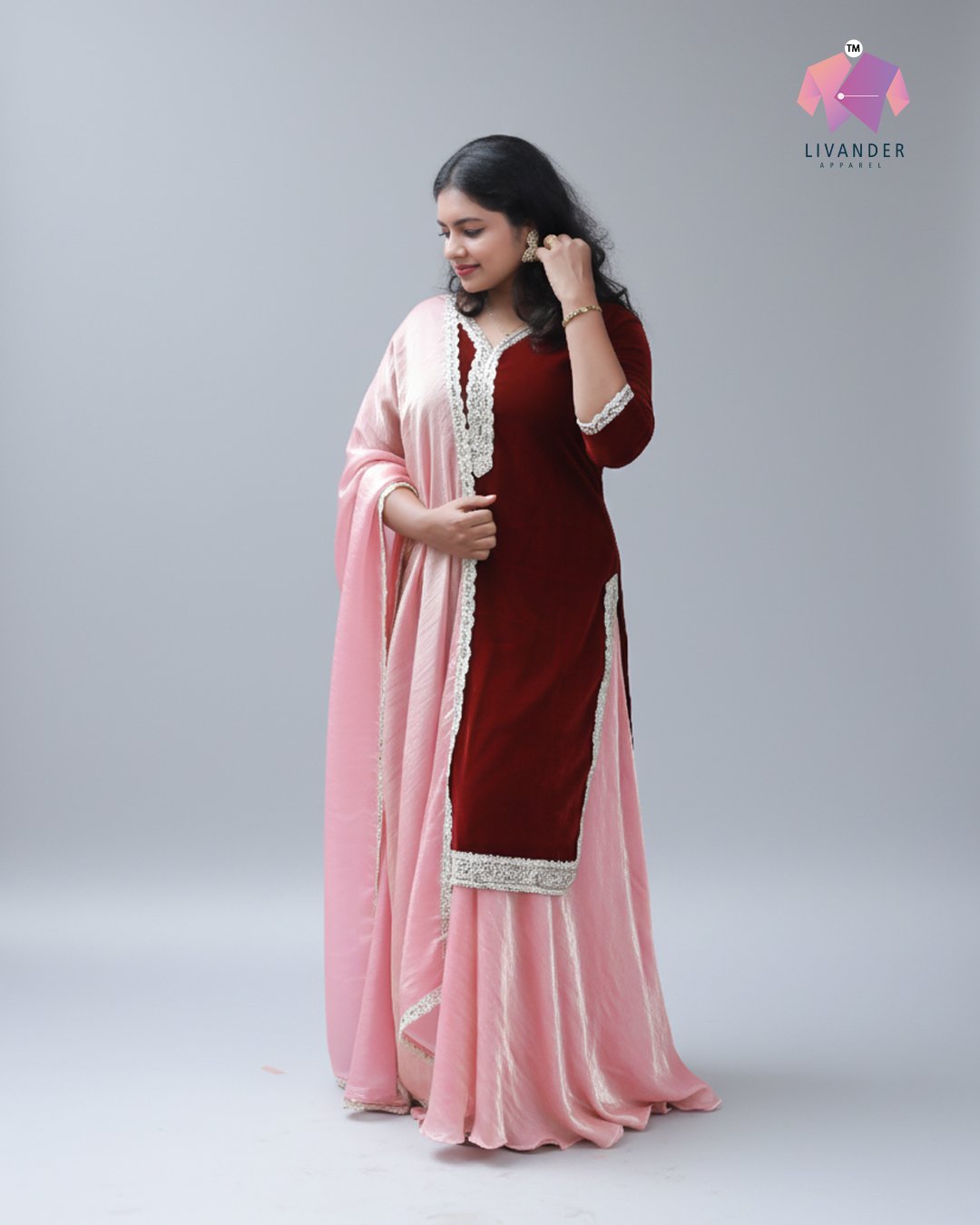 LA00176-Three piece party wear set-Fabric-velvet and fendy-Color-Maroand lighon t peach-Work-lace-Size(M L XL XXL XXXL) ₹ 3,499.00