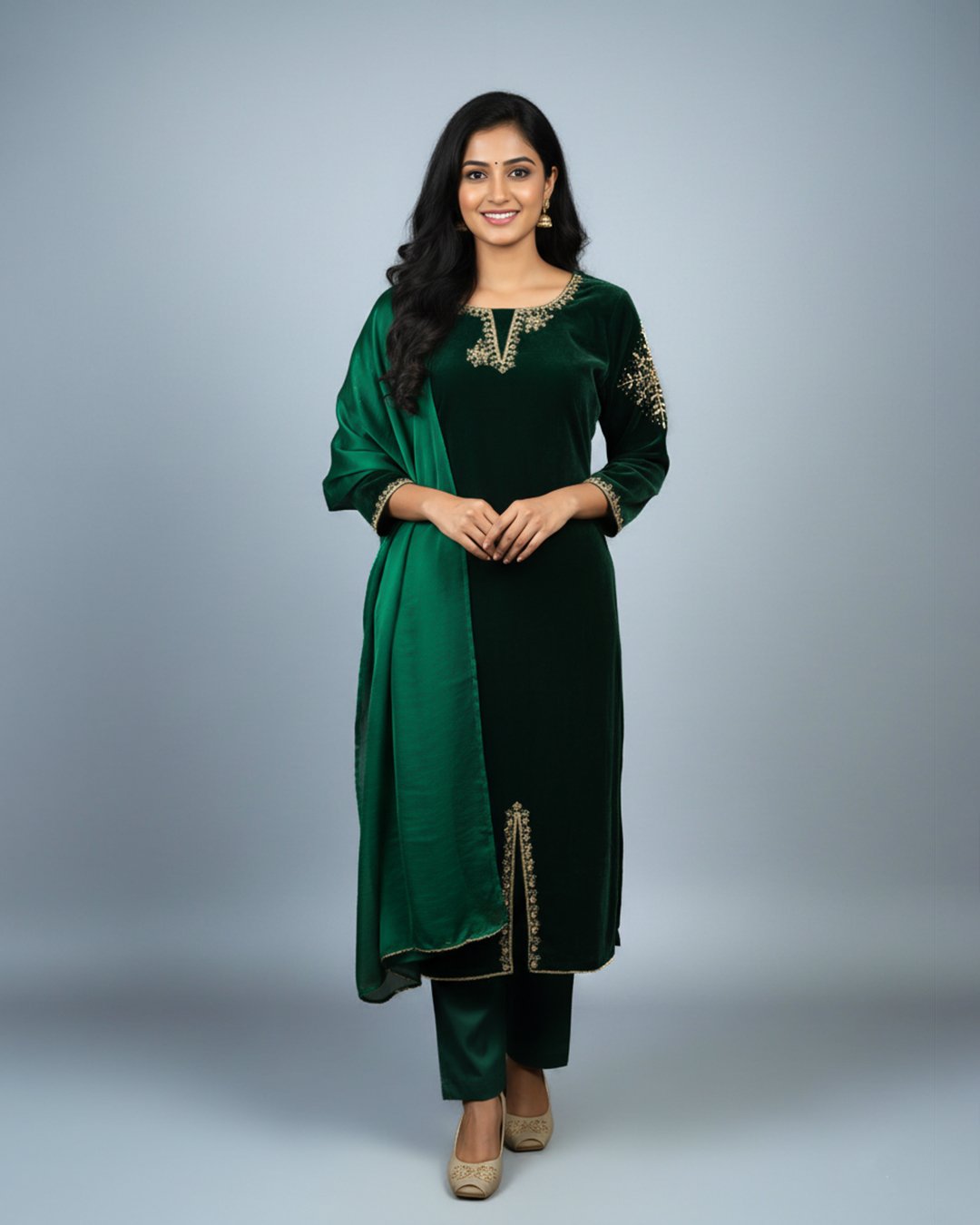 LA00178-Party wear 3 piece set-Fabric-Velvet and Fendy-Colour-Green-Work-Hand work-Size-(M L XL) ₹ 3,799.00