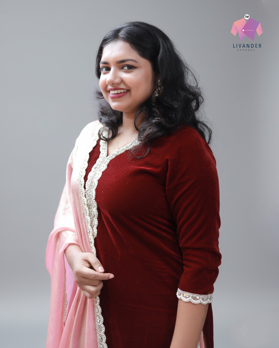 LA00176-Three piece party wear set-Fabric-velvet and fendy-Color-Maroand lighon t peach-Work-lace-Size(M L XL XXL XXXL) ₹ 3,499.00