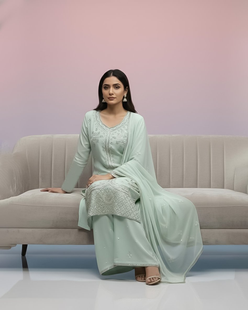 LA00179-Partywear Three piece set-Fabric-Chinone-Color-Mint green-Hand work-Size-(L XL XXL XXXL) ₹ 4,699.00